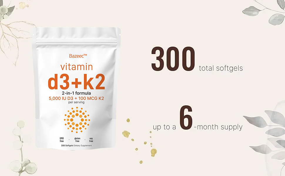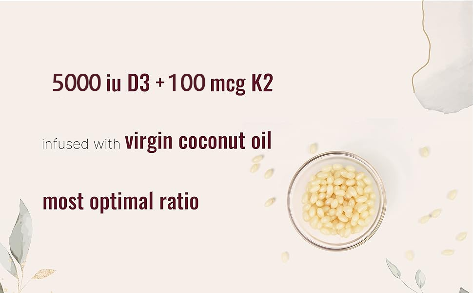 - Each pouch offers 300 easy to consume mini coconut oil infused softgels. A potent one a day complex that provides natural sunshine vitamin synergy. 5000 iu Vitamin D3 and 100 mcg vitamin K2 per dose.